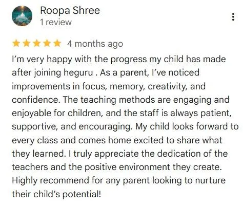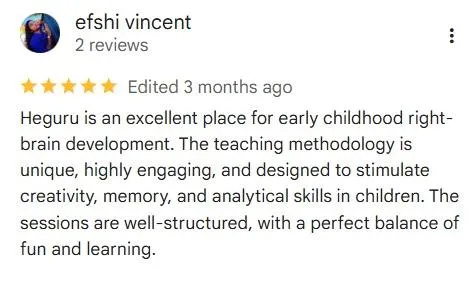 Heguru is a certified Japanese right-brain enrichment program created to support children’s cognitive, emotional, and developmental growth. Individual results may vary depending on the child’s age, participation, consistency, and parental involvement. The content, examples, and testimonials shared on this website are for educational and illustrative purposes only and do not constitute a guarantee of specific outcomes.